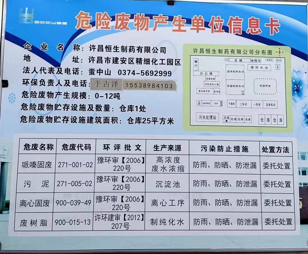 許昌恒生制藥有限公司環保負責人由谷志勇同志變更為于占洋同志,特此公告!